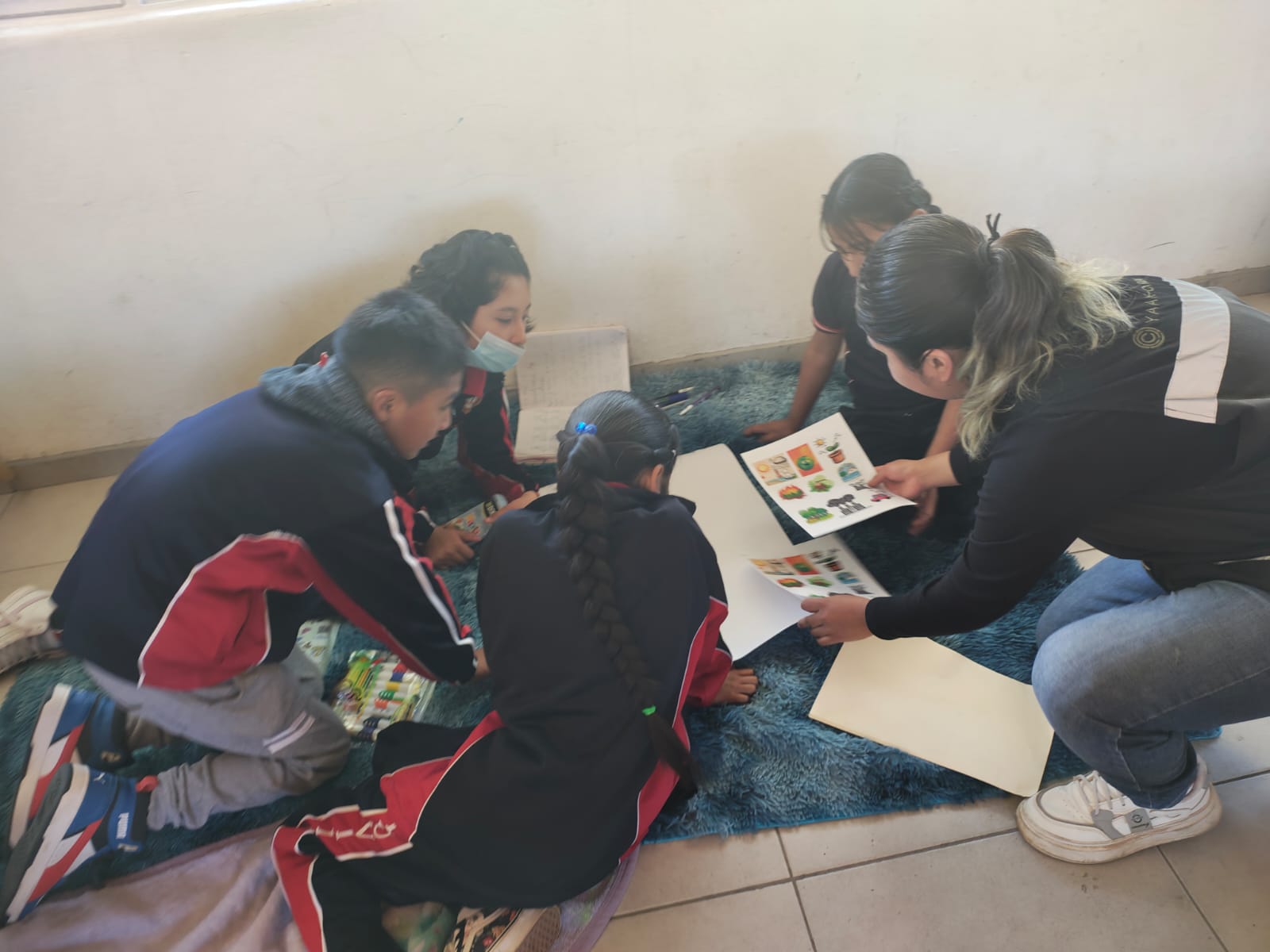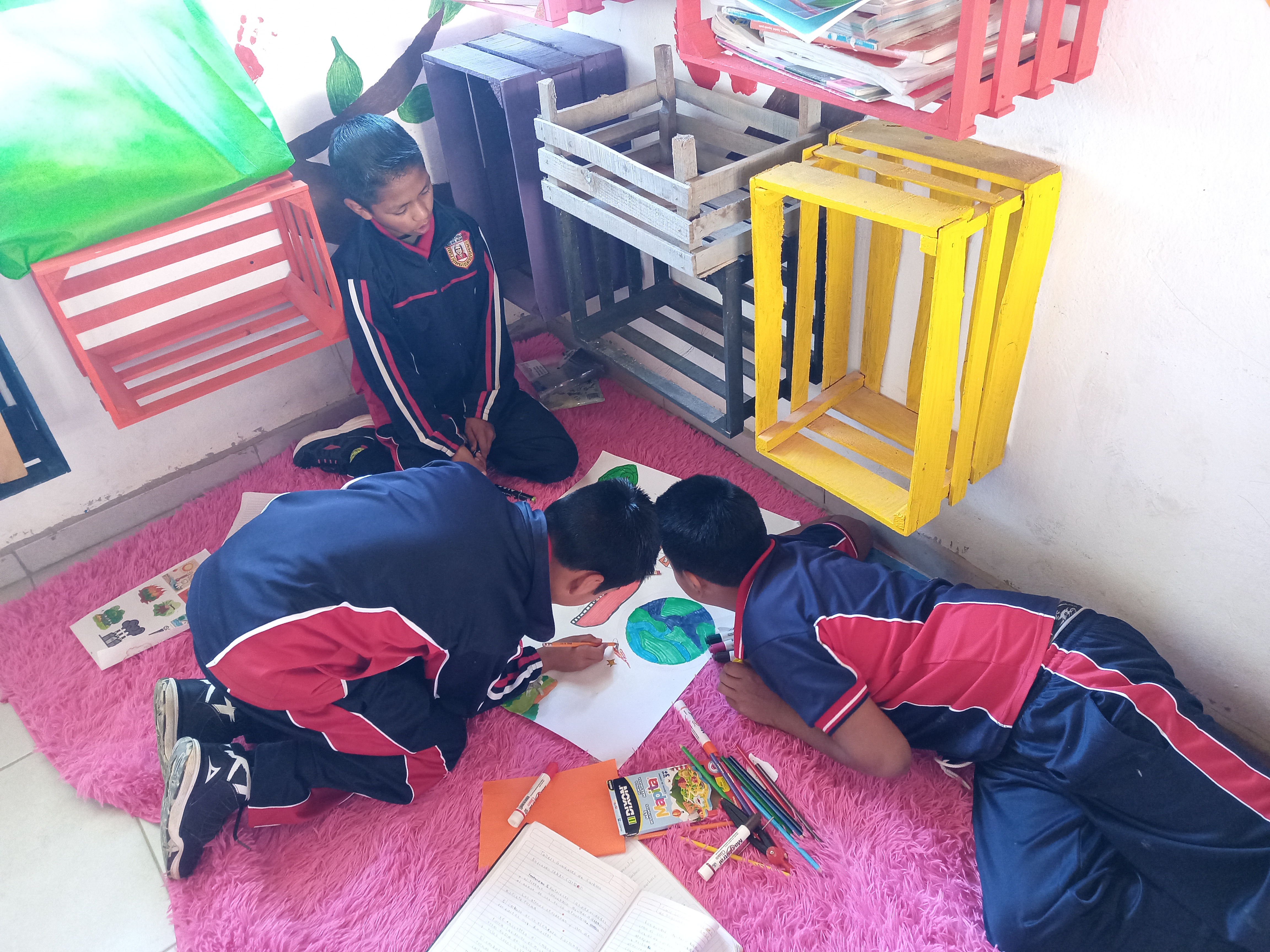 Taller de educación ambiental guardianes del carbono, elaborando carteles para fomentar el cuidado de nuestros bosques