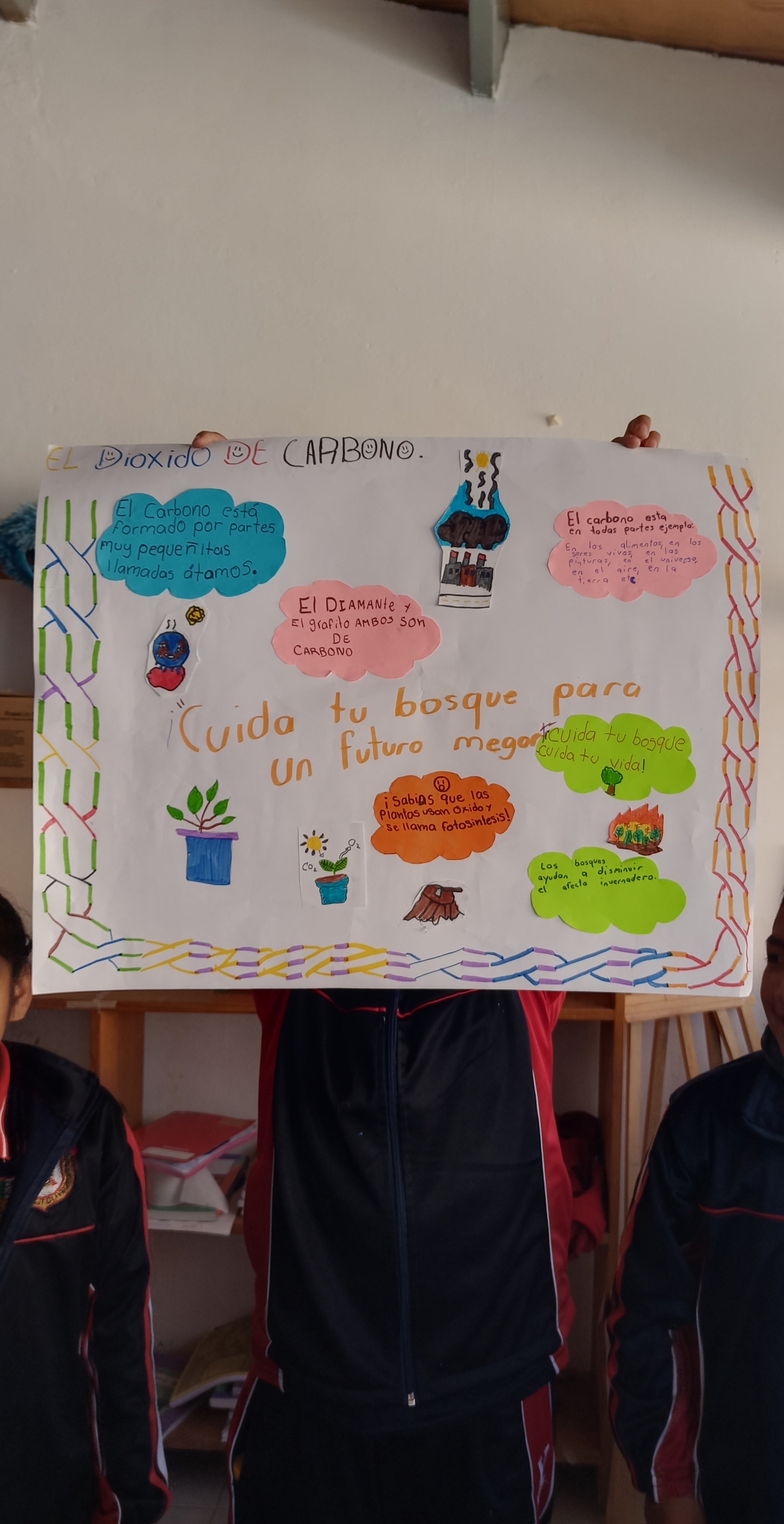 Como parte de la actividad, los estudiantes elaboraron carteles informativos que fueron colocados en distintos espacios de la comunidad. La jornada se caracterizó por una alta participación, interés y colaboración tanto de los estudiantes como del personal docente. Los materiales elaborados quedaron instalados en la escuela y en espacios públicos, contribuyendo a reforzar el conocimiento ambiental y a promover el cuidado del bosque dentro de la comunidad.
